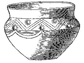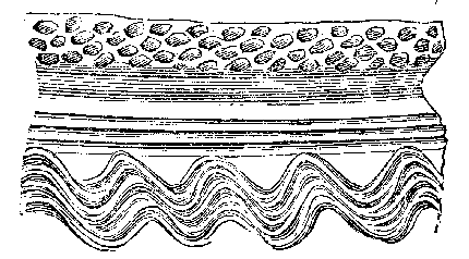 Diese Auslegung der Urnenverzierungen mit Kalk muß in einer gewissen Zeit der Steinperiode sehr verbreitet gewesen sein. Auch von Estorff in den Heidnischen Alterthümern von Uelzen, 1846, bildet dort Taf. XV, Fig. I, eine charakteristische Urne aus der Steinperiode ab, welche nach S. 50 zu Masendorf im A. Oldenstadt in einem Steingrabe neben 3 steinernen Keilen und "sehr großen, ziemlich gut erhaltenen Knochen lagen, welche einem vollständigen menschlichen Skelette angehört zu haben scheinen. Auf dieser becherförmigen Urne ist die eingedrückte, sehr reiche Verzierung mit einer schneeweißen Masse, welche sich an mehreren Stellen erhalten hat, ausgestrichen, was dem Gefäße, der Bestimmung gemäß, etwas Leichenhaftes giebt".