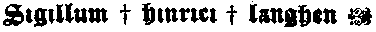 culatim conscripta, sigillis dicti domini Nicolai Boddeker et prefati domini Godfridi Langhen, quondam episcoporum ecclesie Zwerinensis, necnon Hinrici Langhen, proconsulis opidi Luneburg, Verdensis diocesis, patris carnalis prenominati domini Godfridi Langhen. quondam episcopi dicte ecclesie Zwerinensis, a tergo impressis sigillatas de cera rubea, in cuius quidem domini Nicolai, tunc episcopi moderni dicte ecclesie Zwerinensis, sigillo prima facie apparuit imago sancte Barbare virginis et sub pedibus imaginis istius apparuit cignus cum collo inflexo in clipeo sculptus et littere circumferenciales fuerunt hec: Sigillum Nicolai Boddeker episcopi ecclesie Zwerinensis, in aliis vero sigillis apparuit clipeus, in cuius medio sculptus fuit medius vrsus cum capite et medio ventre sine posterioribus et vnius illorum littere circumferenciales fuerunt hec: Sigillum Godfridi Langhen, alterius vero fuerunt hec: Sigillum Hinrici Langhen, exhibuerunt et produxerunt. Similiter produxerunt vnam aliam litteram recognicionis in theutonico conscriptam, sigillis dumtaxat dictorum domini Godfridi Langhen, quondam episcopi Zwerinensis, et Hinrici Langhen, proconsulis opidi Luneborg, patris carnalis dicti domini Godfridi, inferius impressis de cera rubea sigillatas infrascripti tenoris. Quas quidem litteras per infrascriptos testes vna cum suis impressis sigillis, ut moris est et juris, recognosci fecerunt ipsisque vna cum suis sigillis, ut premittitur, recognitis easdem litteras transumi, exemplari, publicari et in hanc publicam formam redigi mandari decretumque et auctoritatem nostram ordinariam et judiciariam per nos interponi debita cum instancia postularunt. Nos tunc Gherardus officialis antedictus dictos citatos non apparentes neque huiusmodi diei termino satisfacere curantes reputauimus non immerito id exigente iusticia prout erant, quo ad actum et terminum huiusmodi contumaces et in eorundem contumaciam infrascriptos testes super recognicione sigillorum dictis litteris impressorum in forma juris recepimus et admisimus, quibus huiusmodi litteris cum suis impressis sigillis ostensis et per eos et eorum quemlibet visis et inspectis necnon ipsis per nos super recognicione sigillorum huiusmodi diligenter examinatis et interrogatis dixerunt successiue et quilibet eorum dixit, se bene recognoscere sigilla ipsis litteris impressa et esse illorum, quorum esse dicuntur, videlicet domini Nicolai Boddeker, domini Godfridi Langhen, quondam episcoporum ecclesie Zwerinensis, et Hinrici Langhen,